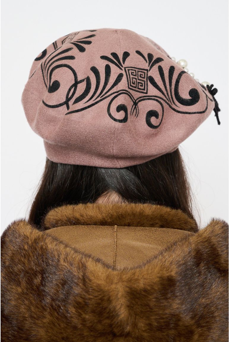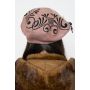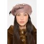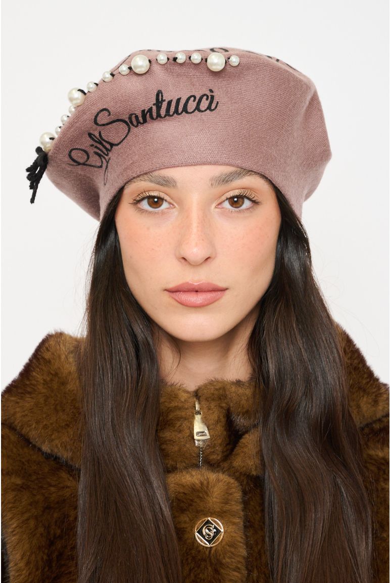 Basco in panno con stampa logo e perle Panno elasticizzato Applicazione con perle Stampa con logo a contrasto Firma Gil Santucci frontale 50%VI 25%PA 25%PL