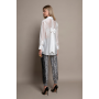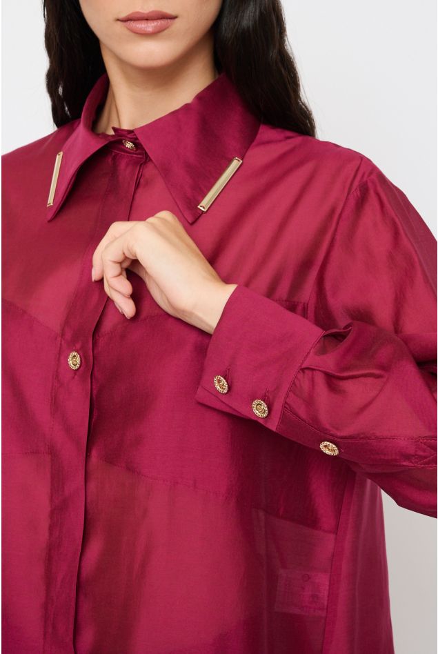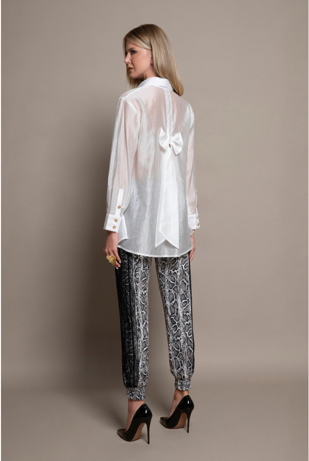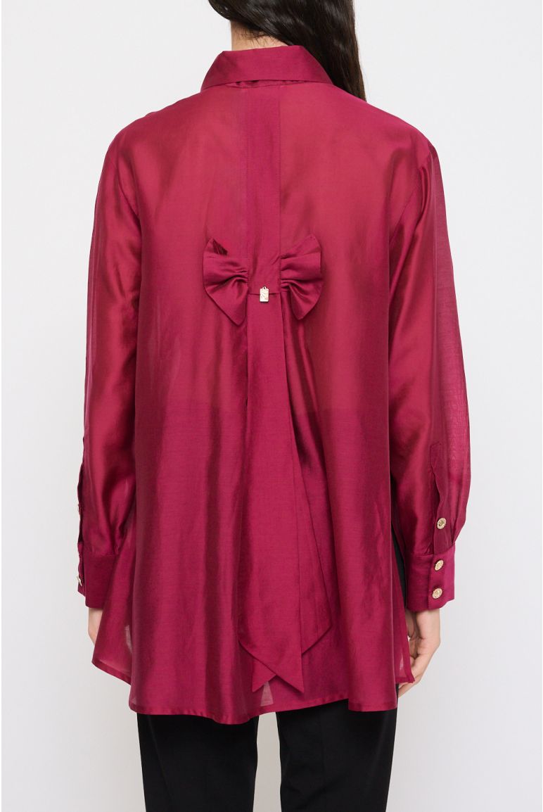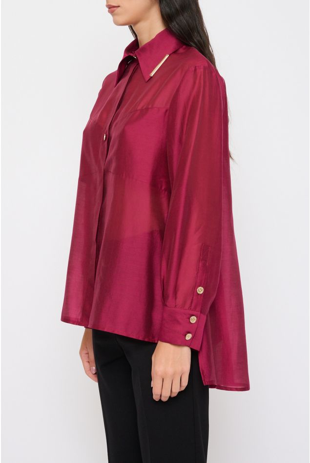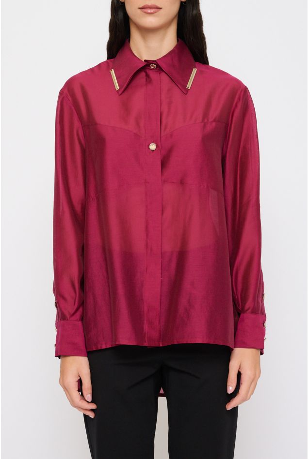 Camicia in taffet lucido, taglio morbido, fiocco sulla schiena Taffet misto viscosa Linea dritta, lunghezza sotto fianco Barrette metalliche al colletto, bottoni gioiello logo Collo a punta con barrette, chiusura copri-bottoni, fiocco removibile 84%TN 16%PL