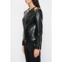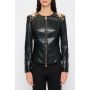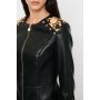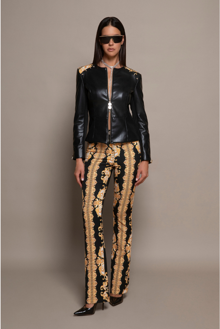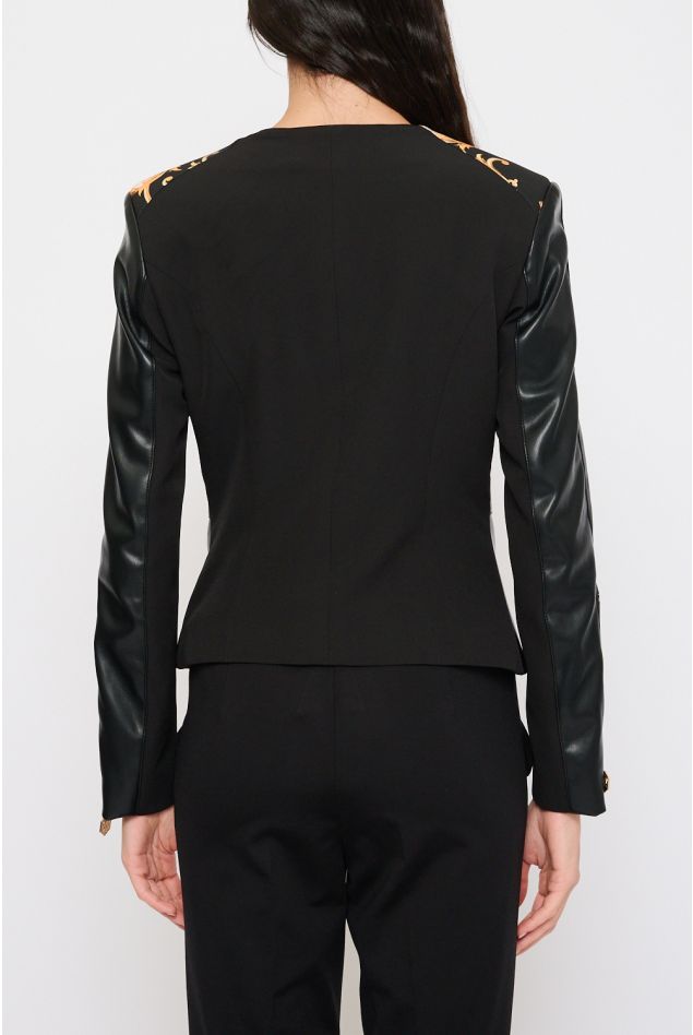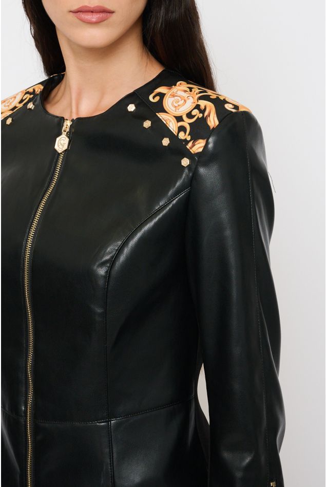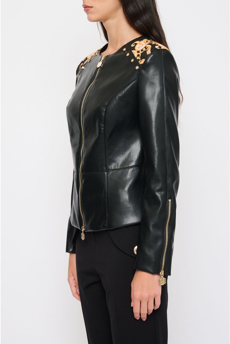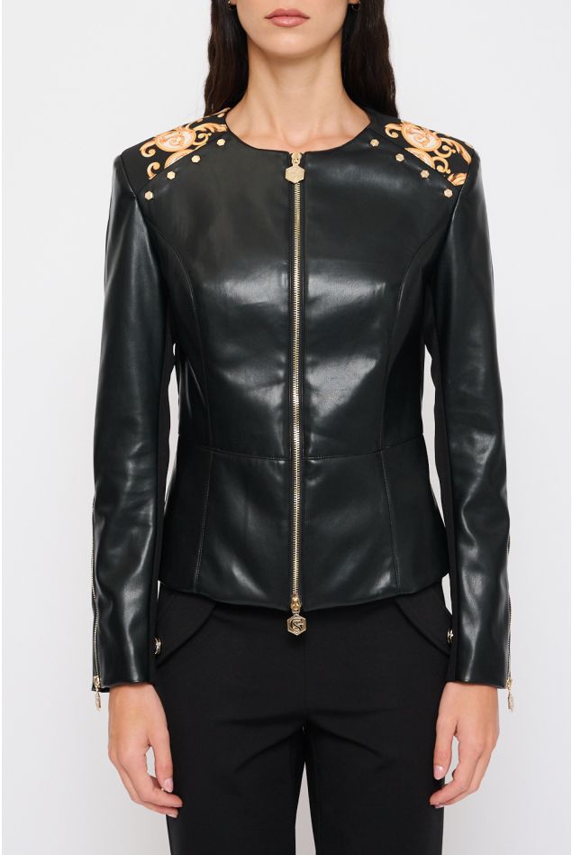Giacca slim fit in eco-pelle con spalle impreziosite Effetto pelle Vita sagomata, lunghezza al fianco Stampa barocca a contrasto sulle spalle e borchie dorate Chiusura frontale con zip a doppio cursore logato, zip ai polsi 50%PL SETIFICATO 50%PU