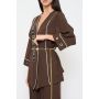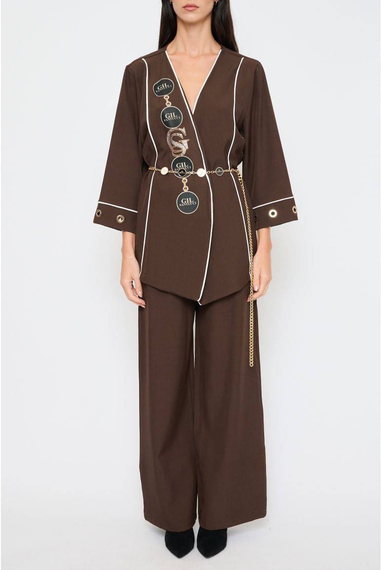 Set con giacca kimono e pantalone ampio Kimono stampato con bordatura Maniche con borchie a occhiello dorate Cintura con charms logati Pantalone a palazzo elasticizzato 95%PL 5%EA